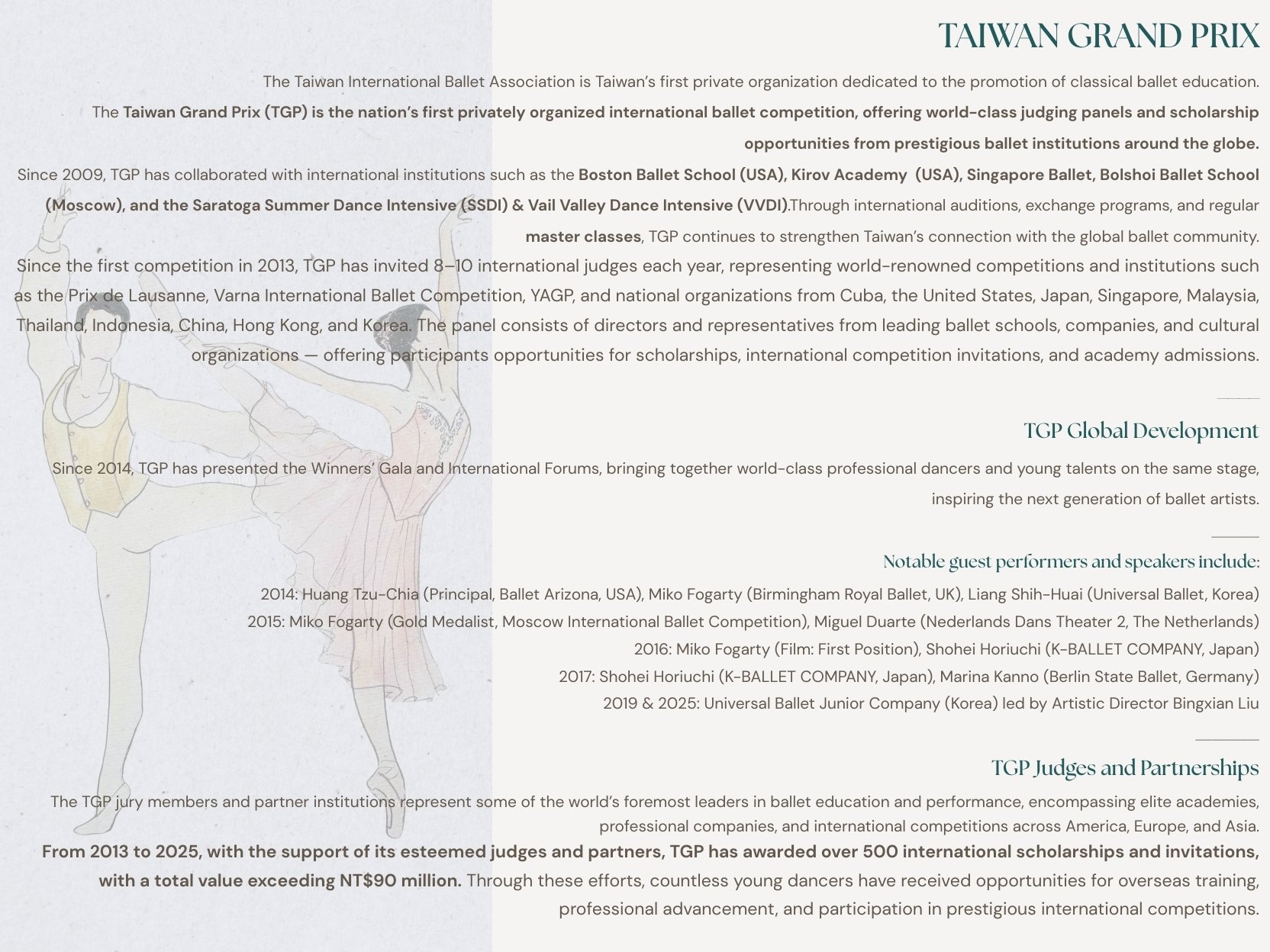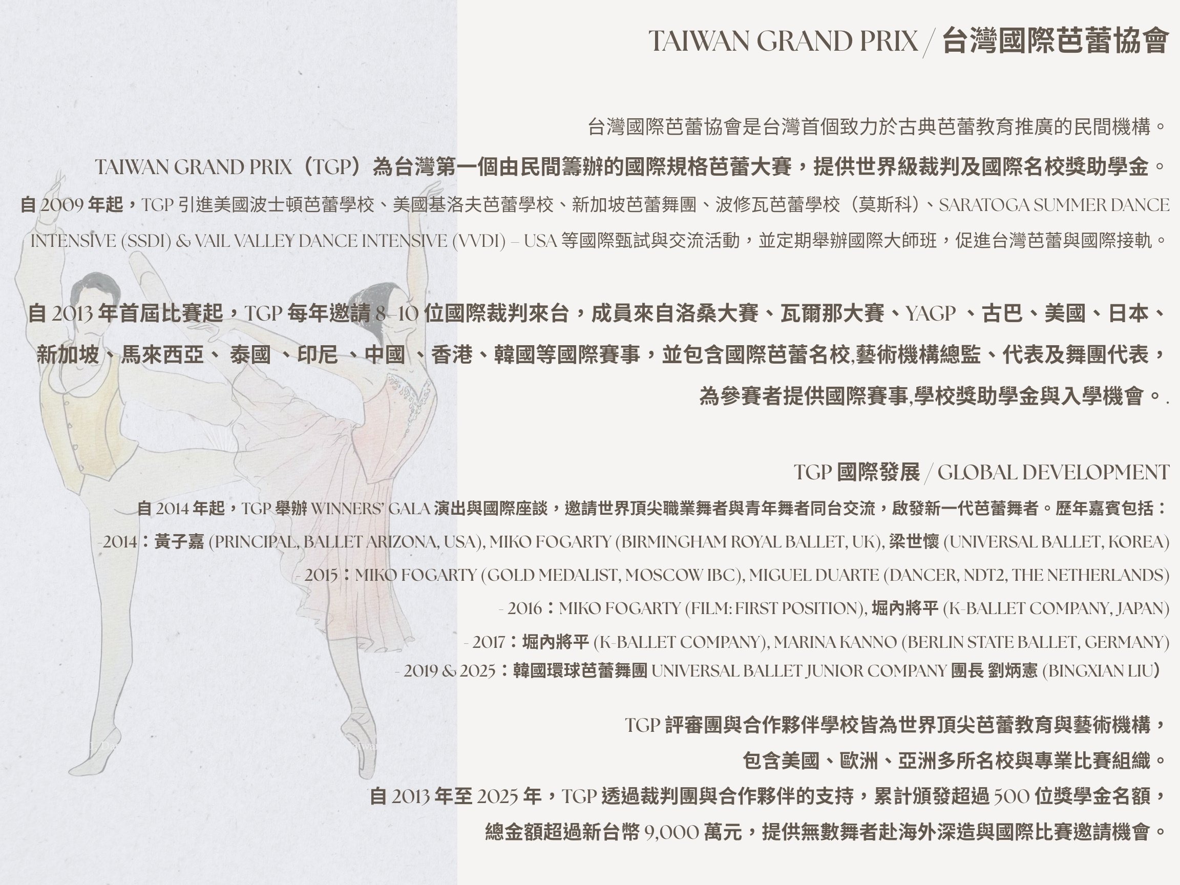 Taiwan Grand Prix 是台灣第一個提供國際芭蕾學校獎助學金與入學資格的國際古典芭蕾比賽