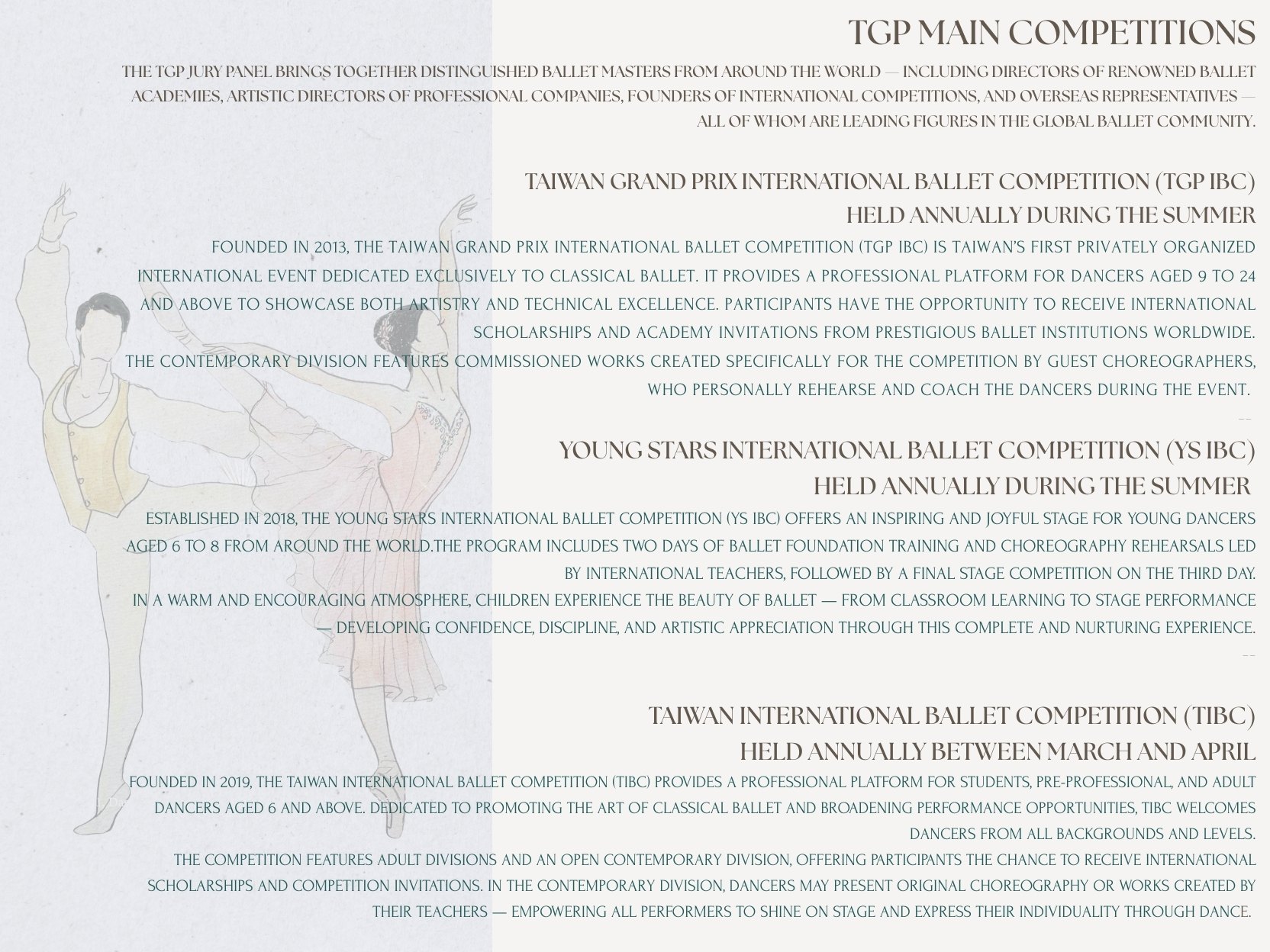 Taiwan international ballet association is the first civil organizer for promoting Classical ballet in Taiwan, It fulfills its mission of dance education through scholarship auditions, master classes, educational and outreach activities, performances and organizing competitions. Taiwan Grand Prix International Ballet Competition (TGPIBC) is the first international ballet competition from Taiwan provided international ballet school admission and scholarships form 2013. Participant is given an opportunity to compete for admission and scholarships from the United States, Canada, Germany, Austria, Portugal and over 16 international ballet school. Over the past 5 years, TGPIBC has awarded 168 alumni over USD$1,700,000 in scholarships to the world’s leading dance schools TGPIBC invite judges from various international ballet competitions: Prix de Lausanne Ballet Competition, Varna International Ballet Competition, New York, United States YAGP finals, Cuban International Ballet Competition, the US International Ballet Competition, the New York International Ballet Competition, Beijing International Ballet Competition, Japan Ballet Competition to join the festivities.