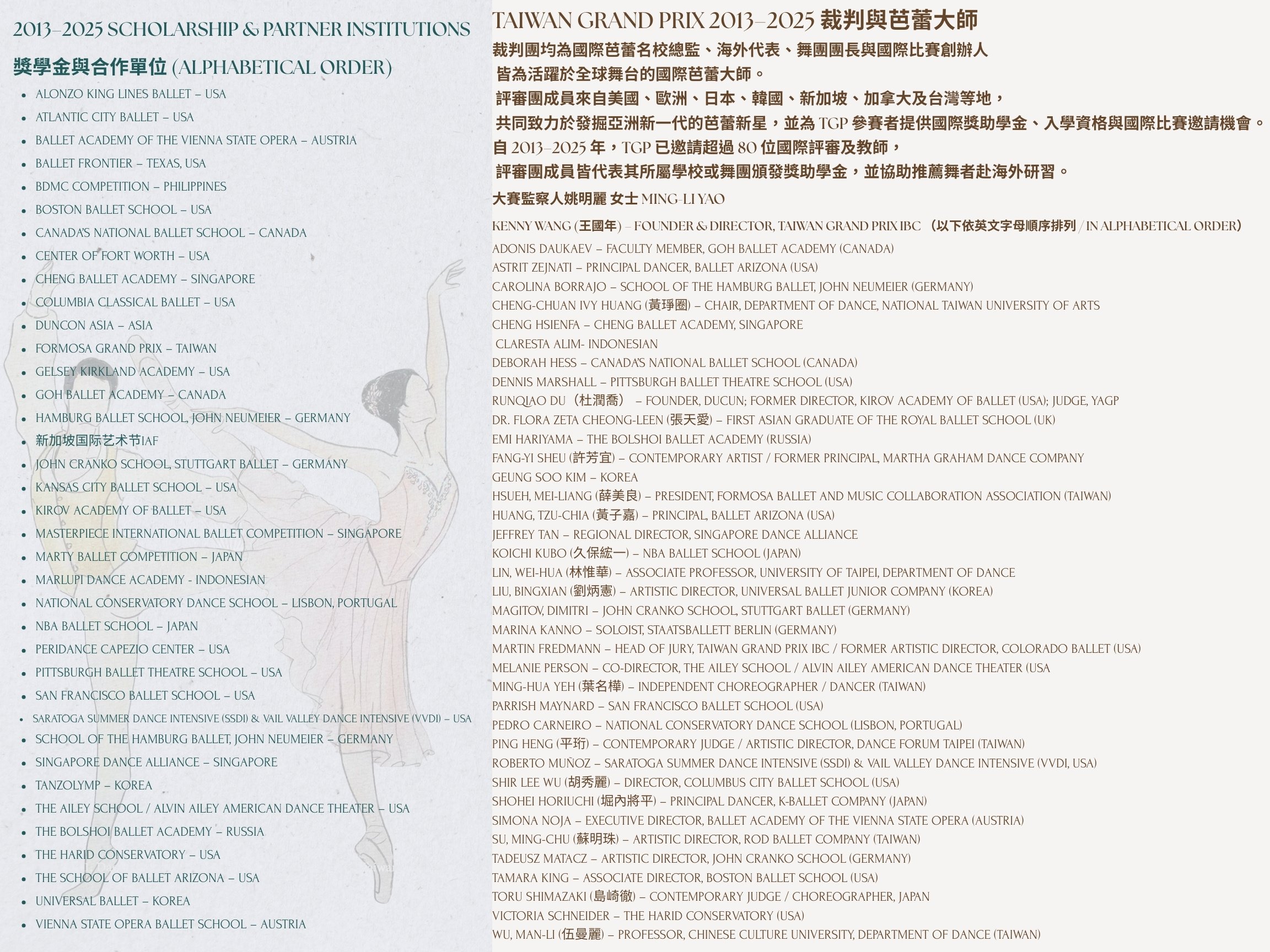 Taiwan Grand Prix 是台灣第一個提供國際芭蕾學校獎助學金與入學資格的國際古典芭蕾比賽